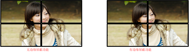 所有拼接显示单元都有一定物理边框缝隙,在无边缘屏蔽功能处理情况下,图像会出现视觉上拉扯开的现像,感觉很不自然;经过边缘屏蔽处理的图像无变形、拉伸,视觉更自然逼真。如下图边缘屏蔽处理前后对比图片;