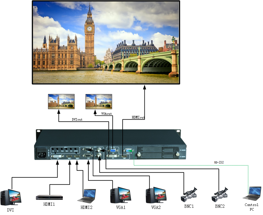 1路HDMI、1路DVI和1路VGA信号同步输出,HDMI和DVI可驳接发送卡,VGA用于视频信号同步监控.